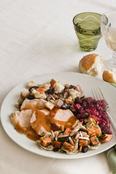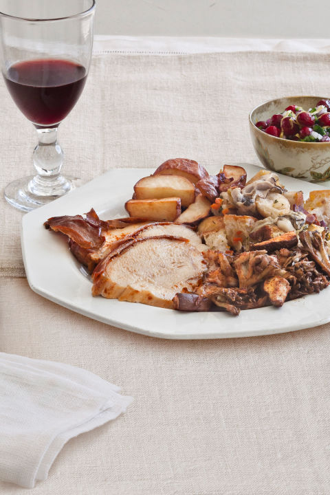 Cranberry sauce with a hint of exoctism, dressing with bay leaf and sage, and salad with slightly bitter chicory give this Thanksgiving menu huge bursts of flavor.